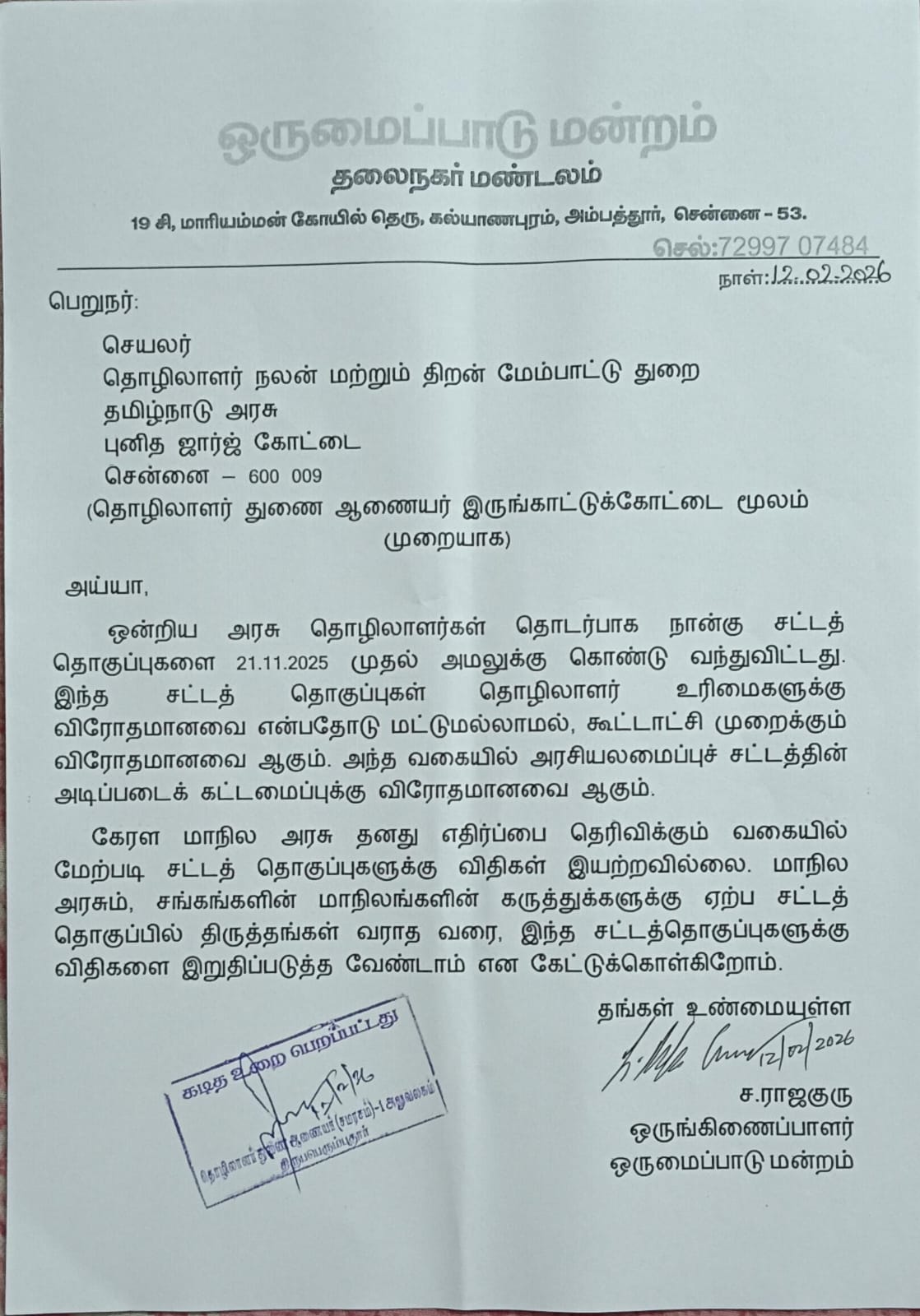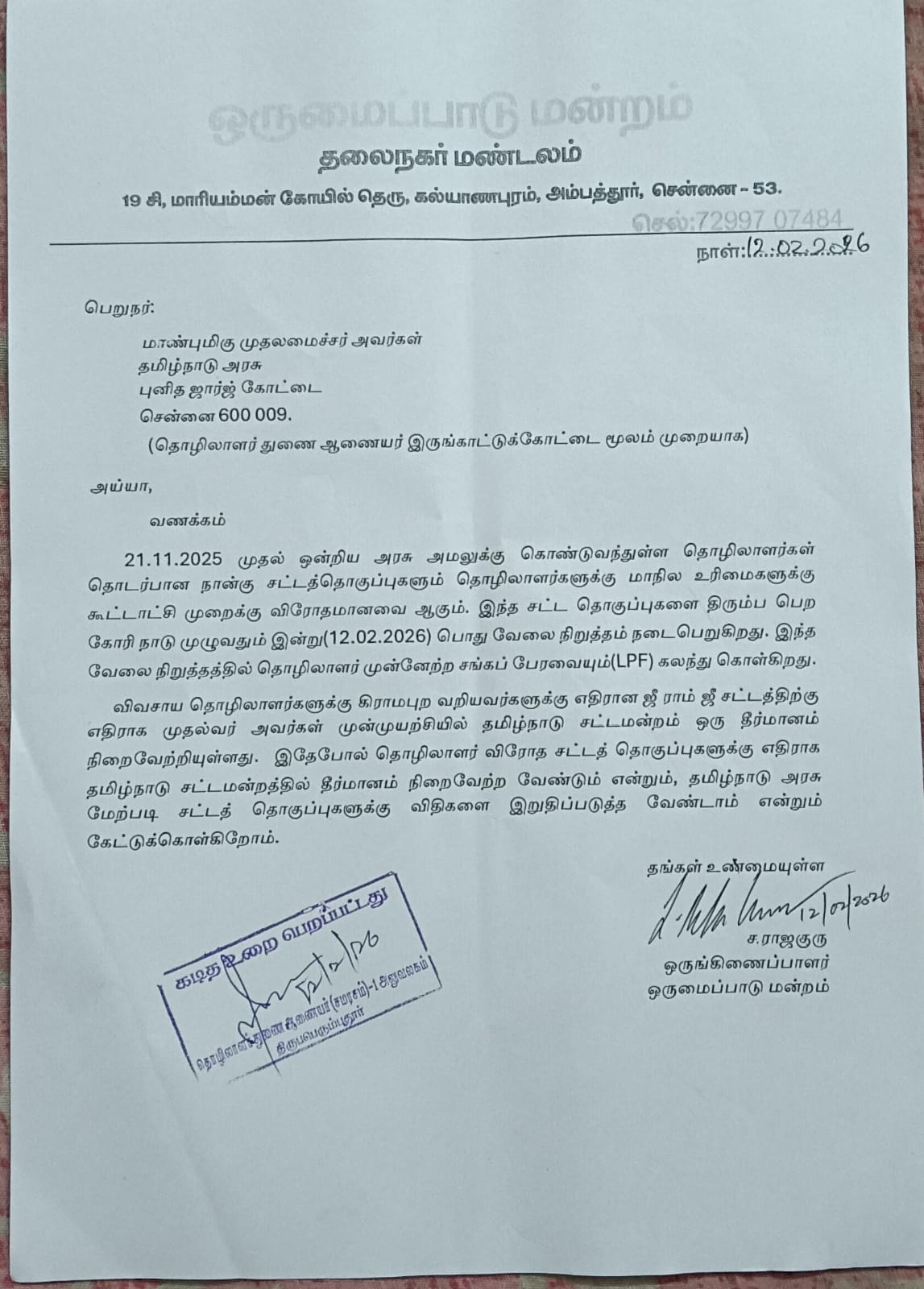 . தொழிலாளர் விரோத நான்கு சட்டத் தொகுப்பு எதிராகவும் மக்கள் விரோத பல்வேறு சட்டங்களுக்கு எதிராகவும் இன்று நாடு முழுவதும் நடைபெற்ற வேலைநிறுத்த போராட்ட கோரிக்கைகளுக்கு வலுசேர்க்கும் விதமாக ஒருமைப்பாடு மன்றம் ஒருங்கிணைத்த நிகழ்வில் ஸ்ரீபெரும்புதூர், இருங்காட்டுகோட்டை , ஒரக்கடம் சிப்காட் தொழிலாளர்கள் பிப்ரவரி 12 மாலை இருங்காட்டுக்கோட்டை சிப்காட்டில் உள்ள தொழிலாளர் துணை ஆணையர் அலுவலகத்திற்கு பேரணியாக சென்று தொழிலாளர் விரோத சட்டங்களுக்கு எதிராக தங்களது எதிர்ப்பை பதிவு செய்து கடிதம் வழங்கினார்.